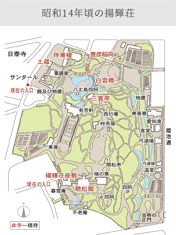 揚輝荘が建つ覚王山の丘陵地は、広さ約1万坪。池泉をめぐらすなど、起伏に富んだ地形や周囲の自然を活かすように工夫がなされています。最盛期には、歴史的・建築的価値の高い30数棟に及ぶ建物がありました。