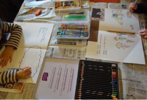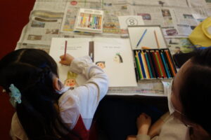 子どもたちは持参したクレヨンや絵具、色鉛筆などを使いながら、自由な発想でのびのびと制作を進めていました。